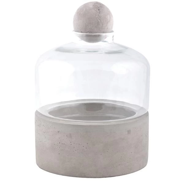 Leuke kweekstolp voor het opkweken van allerlei zaden, stekjes of plantjes die van de nodige luchtvochtigheid houden. De glazen stolp past perfect op de mooi gepolijste grijze betonbasis en kan bovenaan worden afgesloten met een bijhorende betonkogel.