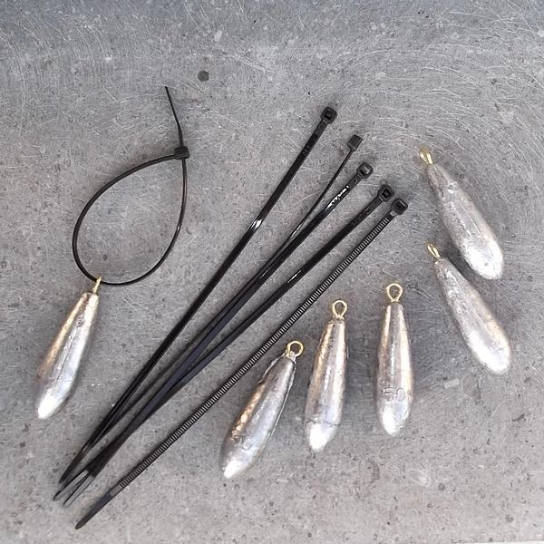 Loden gewichtjes van ca. 50 gram met ophangoog en kabelbinder. Deze set bestaat uit gewichtjes van lood in druppelvorm, bovenaan het gewicht is een ophangoog voorzien en met behulp van de kabelbinder hang je elk gewicht vlot op.
