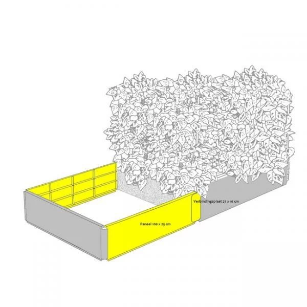 Deze set bestaat uit twee kunststof panelen van 1 m bij 25 cm waardoor u de oppervlakte van jouw groeibed kan verdubbelen. Twee verbindingsplaaten van 23 x 10 x 0,4 cm en een ijzeren u- vormige beugel zorgen ervoor dat de twee lange zijden van het uitgebreide groeibed toch voldoende stevig blijven.