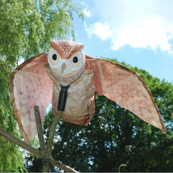 Met deze replica van een kerkuil verjaag je de vogels in jouw tuin of rondom gebouwen en loodsen. Deze vogelschrik is zo gemaakt dat zowel de vleugels als het lichaam van de uil bewegen bij het kleinste zuchtje wind waarbij het gebruikte materiaal ook nog eens lawaai zal maken. De grote kop is voorzien van donkere, reflecterende ogen!
